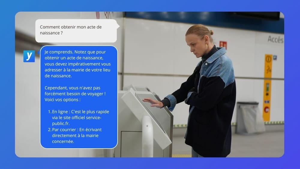 - Adaptation géographique : L’agent peut adapter ses réponses selon la commune de résidence de l’usager. Par exemple, un citoyen vivant à l’étranger peut être guidé dans sa demande d’acte de naissance, obtenir la liste des pièces à fournir, et recevoir l’acte directement par email.