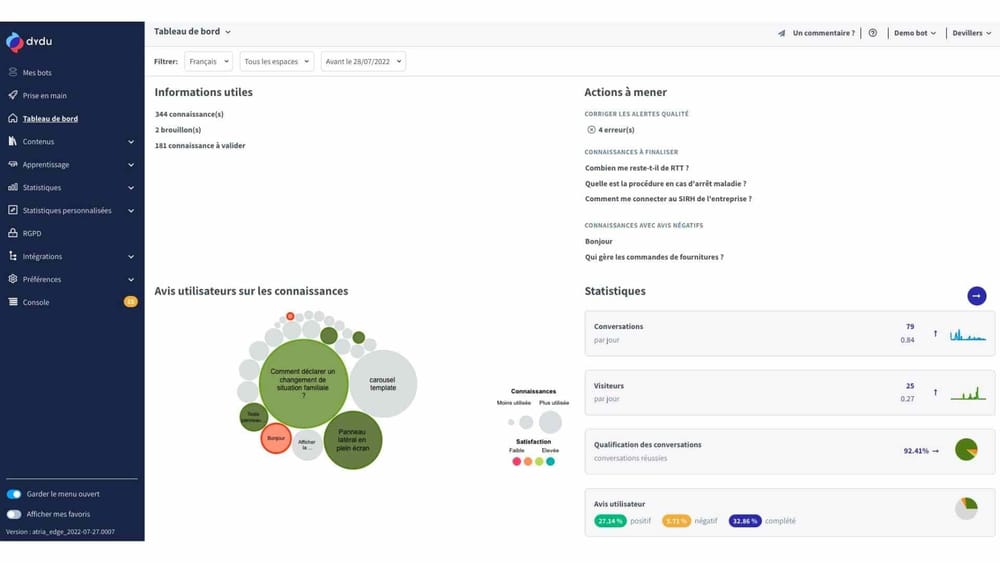Dydu est une plateforme française unifiée de création de chatbots et voicebots sans code. Reconnue pour ses performances (plus de 90 % de précision en reconnaissance vocale) et son hébergement 100 % conforme au RGPD, elle garantit une maîtrise complète des données.