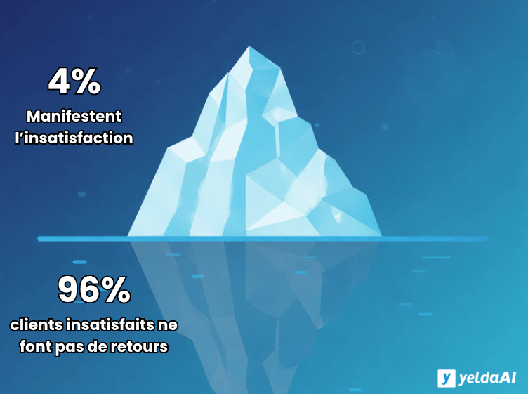 - Uniquement 4 % des clients manifestent leur insatisfaction à l’entreprise. Parmi le 96% de clients instatisfaits qui partent sans donner de retour, 91 % ne reviendront plus jamais.