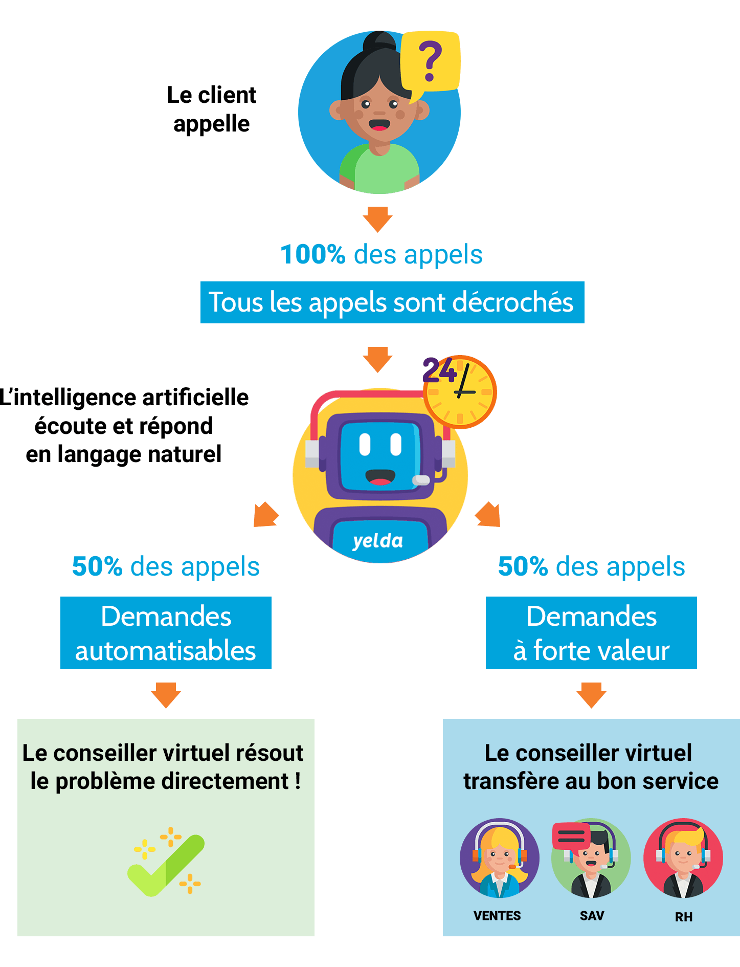 Our SaaS platform is the easiest way to create your company's callbot. The bots created with Yelda are intelligent: in real natural language, and they improve by themselves over time.